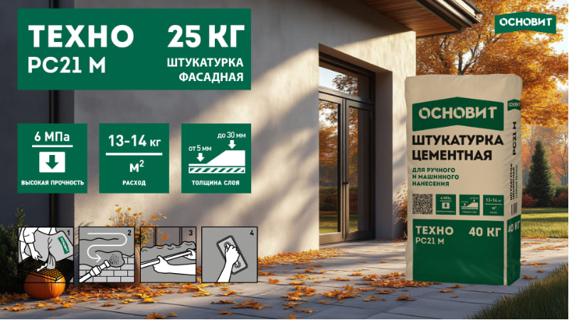 ТЕХНО PC21 M — это цементная штукатурка, которая сочетает в себе лучшие свойства традиционных и инновационных составов. Ее особенности: